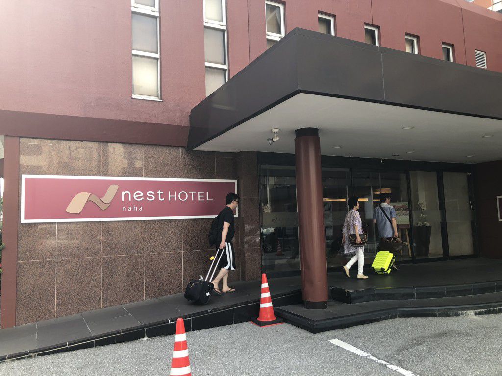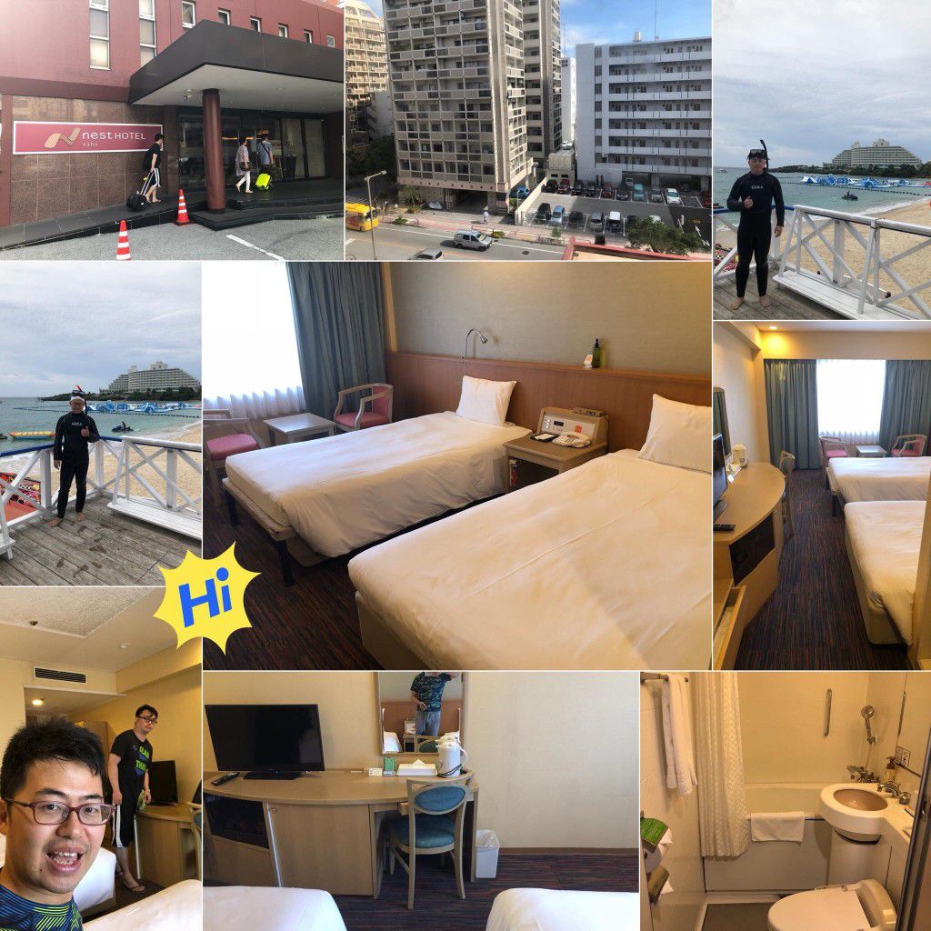 下午在沖繩洲際岸邊浮淺完拍個照後,我們換好衣服回飯店就搭上利木津巴士回到那霸巴士總站,走路五分鐘就來到今日入住的飯店-Nest hotel啦!這間飯店還不差,除了有一點舊之外基本上都不賴,也有浴缸🛁可以泡澡,按往例,先來張開心打卡組合照吧^^