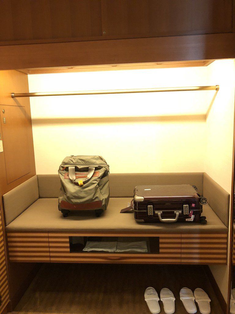 行李置放區,空間也是非常的大,下方擺放兩雙客房拖鞋
