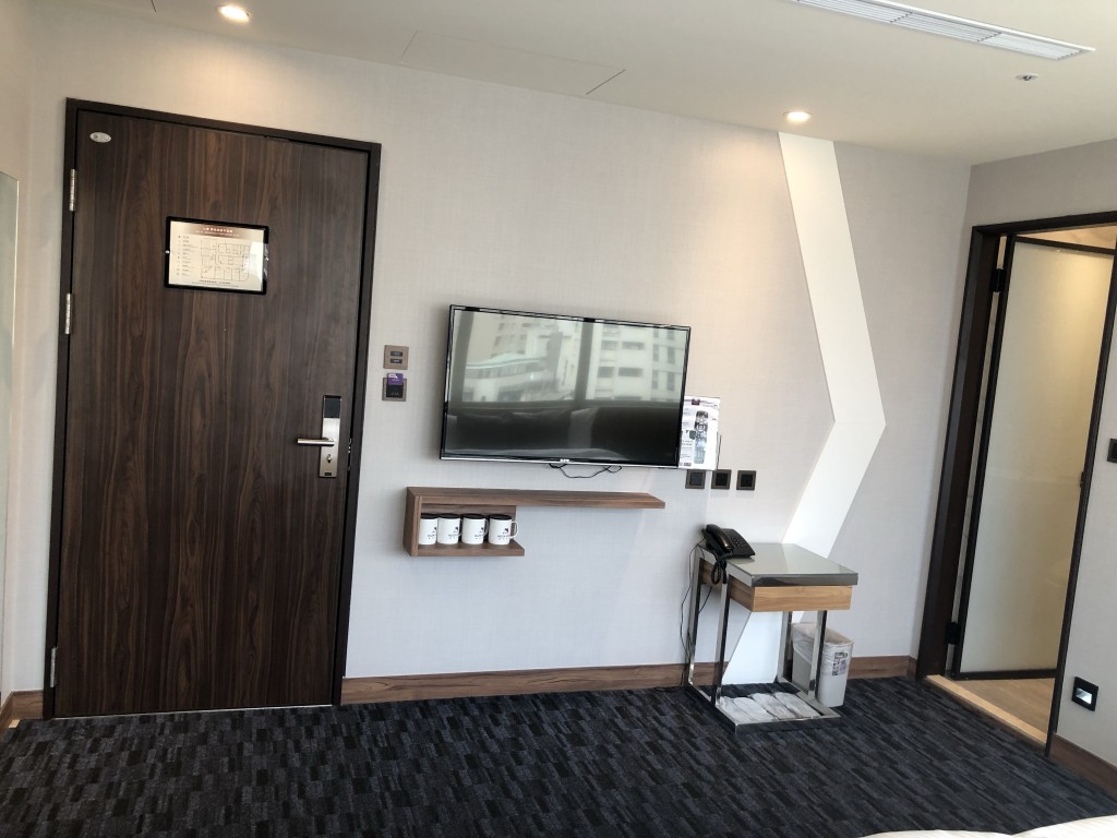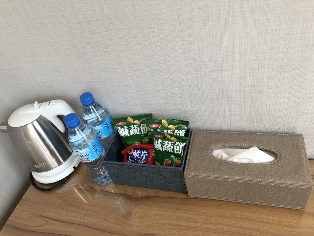 床旁邊有一個書桌可以使用電腦,書桌上有提供礦泉水、熱水壺以及餅乾*4還不錯
