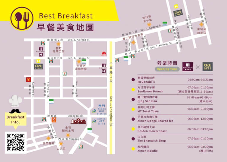 早餐的部分由於飯店是給我們55元的餐券*2,可以到附近的餐廳使用,也可以選擇外送到飯店,所以基本上算是很不錯的!分享官網上的資訊「早餐美食地圖」以及「各店地址及營業時間」給大家~