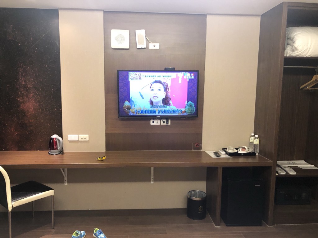 往床尾方向一拍,電視吊掛在牆上可以節省空間,而且有個木製平台上可以放東西以及辦公還不錯