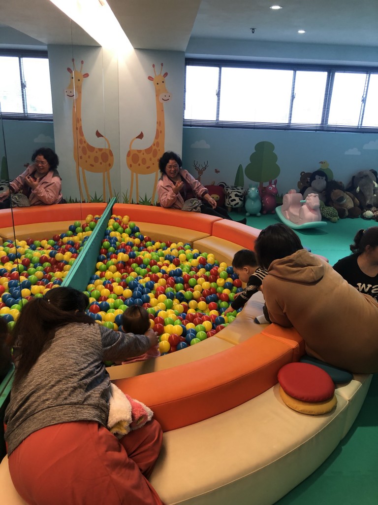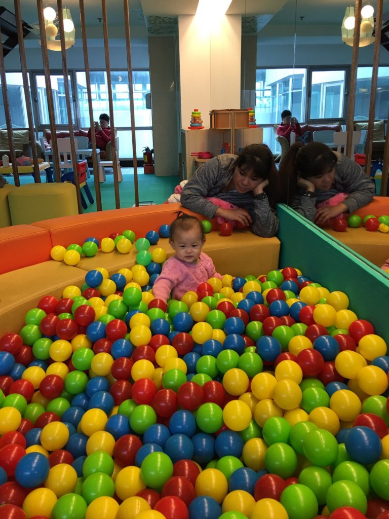 我們把一歲半不到的小Cathy丟到球池裡,讓她體驗一下球池