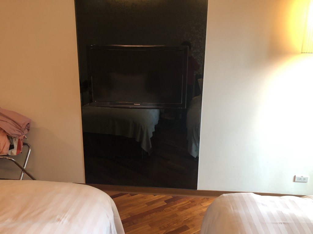 往床尾方向一拍,電視吊掛在牆壁上可以省空間還不賴