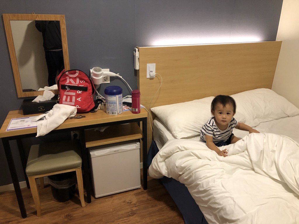 床旁邊是書桌,書桌可以當化妝桌,也有吹風機可以使用,下面還有冰箱可以冰東西,現在回看當年的小Cathy好可愛喔>< 都1歲8個多月了頭髮還那麼少XD
