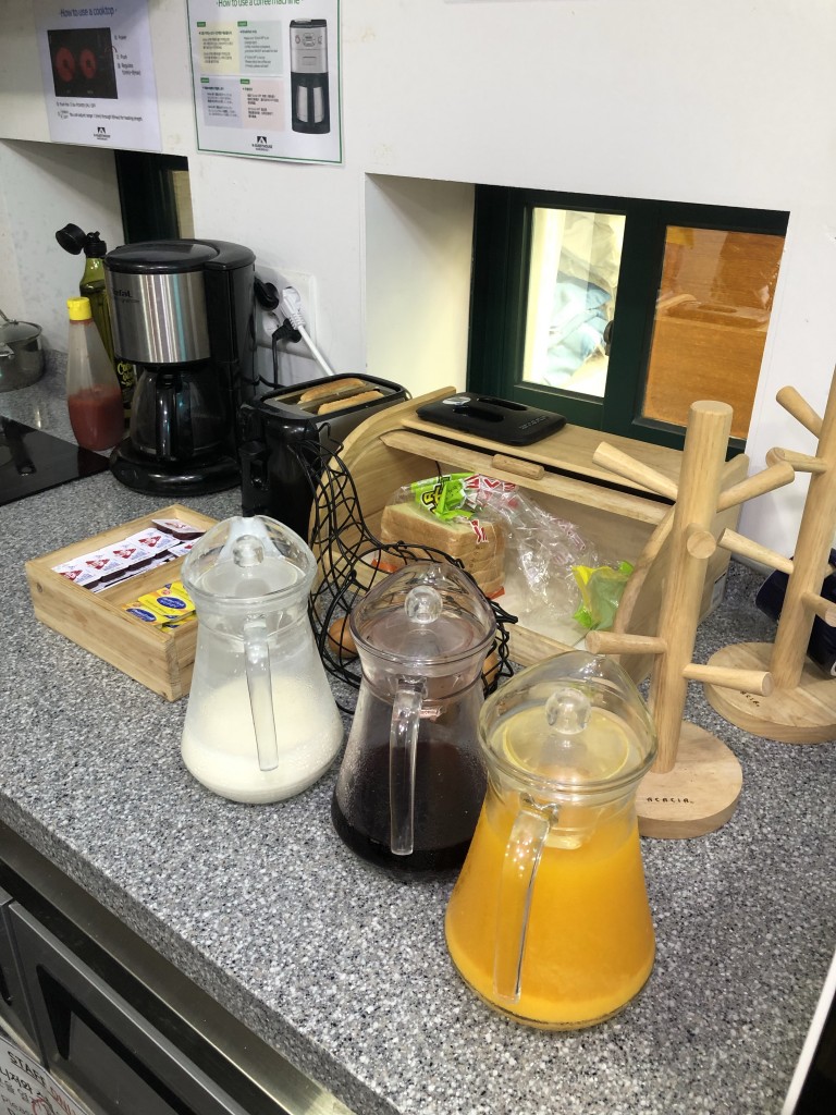 隔天早上起床後就到廚房區準備享用早餐,飯店準備了柳橙汁、葡萄汁與鮮奶,也可以烤土司開心吃一下