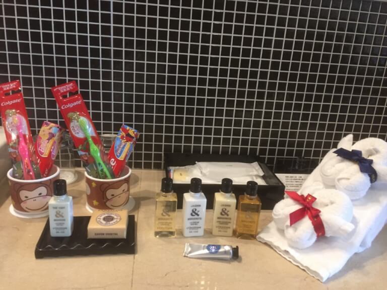 飯店準備了兒童牙膏牙刷,歐舒丹備品,連毛巾都摺成很高檔的fu,怪不得飯店評分這麼高
