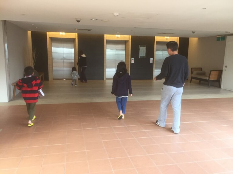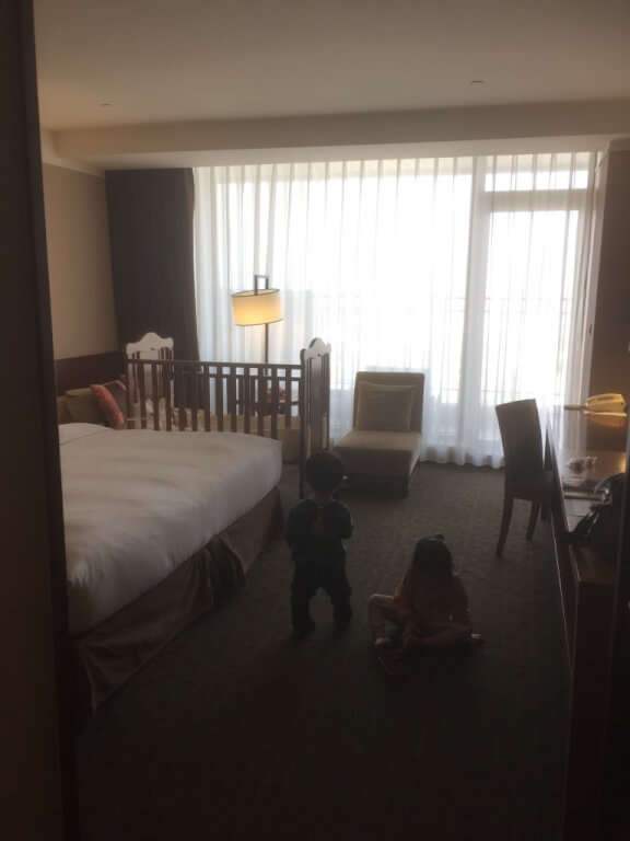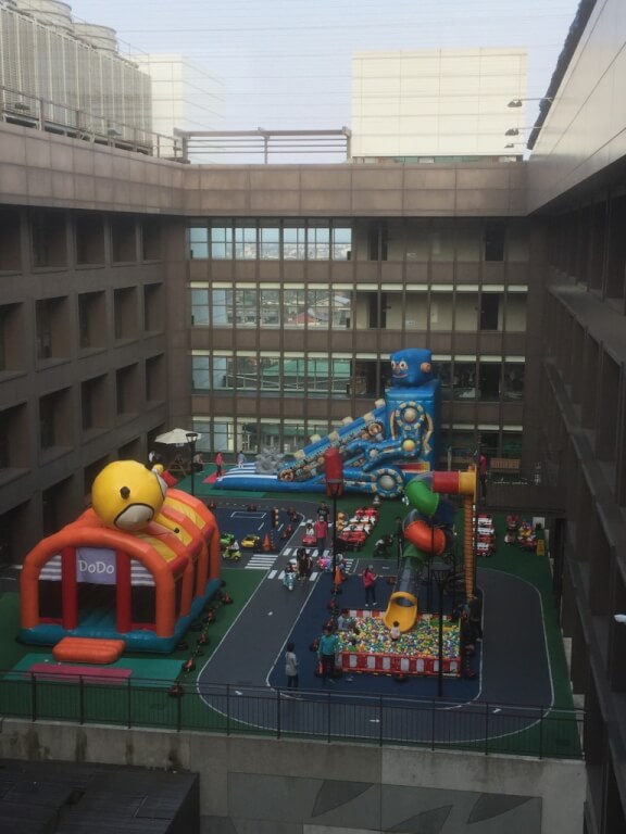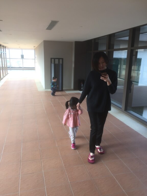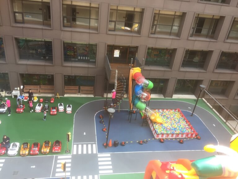 帶小孩玩水完飯店櫃檯打電話來說房間好了,因此就準備進房,這次入住的是11樓的房間,往中庭看過去可以看到8樓最夯的芬朵奇兒童遊樂區~小孩子一出房門看到這應該很high吧!