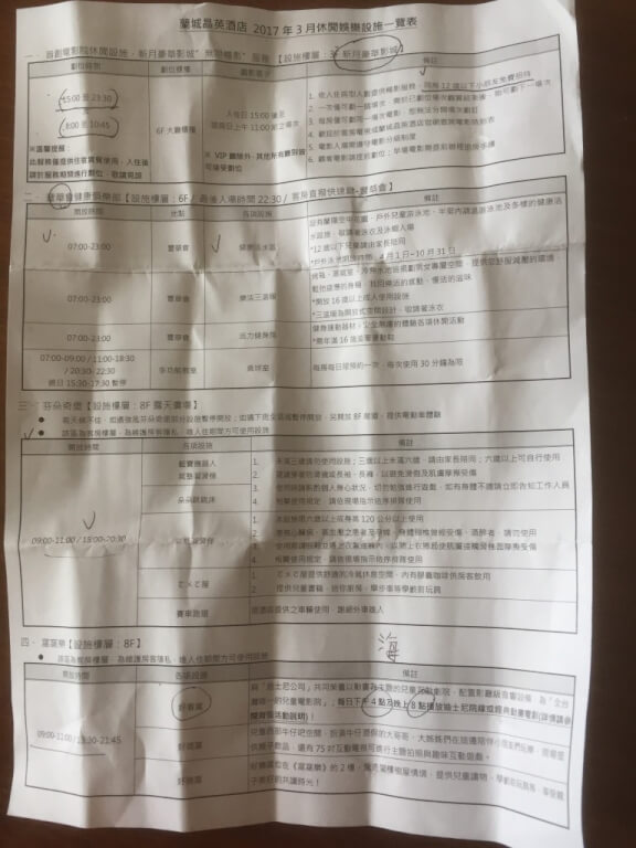 附上被我們折爛掉的休閒娛樂設施及飯店活動XD 內容包含1. 進房當日15:00到隔日退房11:00可以看電影(需事先劃位) 2.健康活水區(泳池),三溫暖及健身房 7:00~23:00開放 (戶外泳池僅4月到10月有開放) 3. 桌球室(可用30分鐘) 4. 8樓芬朵奇堡當日15:00~20:30及隔日9:00~11:00 5.窩窩樂16:00及20:00播放動畫