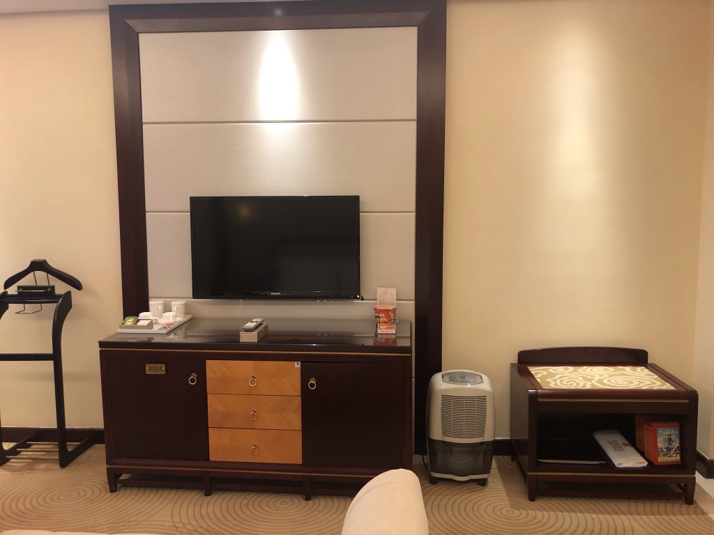 往床尾方向一拍,電視吊掛在牆壁上,電視櫃櫃上可以放東西,茶包與咖啡包也在上面,旁邊也有個行李櫃