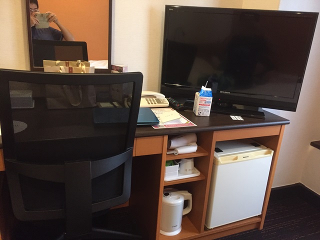 床旁邊有電視與梳妝台、冰箱、電話、工作椅等,標準日榜商務飯店的配置