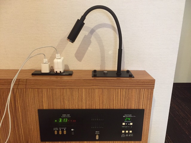 飯店大概知道我們會在床頭充電、放眼鏡、放手機,就做了個檯子,整個設備系統也在床頭一次搞定,good!