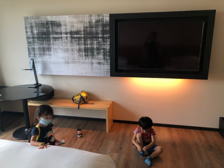 下午3:30在高鐵桃園站搭上喜來登的接駁車後就來到飯店(住這間飯店一定要善用接駁車,搭公車可能比較不容易),這次由於飯店沒提供早餐,因此就讓雙寶在木樂地玩了一個小時後就讓他們午睡2小時,接著吃晚餐回房間洗澡,洗完澡就讓他們自由活動啦!今日入住雅緻客房兩中床的房型約11坪還不錯,房間由於有更新過都是全新的感覺,不過這次的房間是沒浴缸的有點沒意思,另外由於疫情期間泳池與水療沒開放也是有點無趣倒是,不過電視很大一台約有55-60吋還不賴,窗外是面桃禧航空城新館的景觀也還行,按往例,先來張開心打卡組合照吧^_^