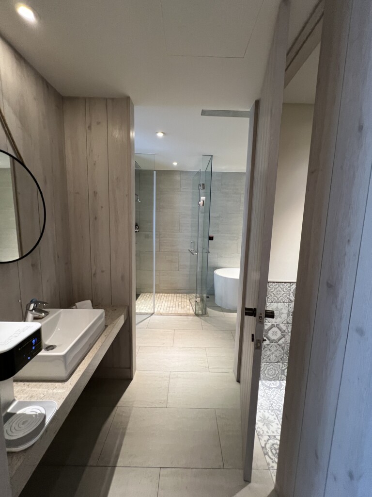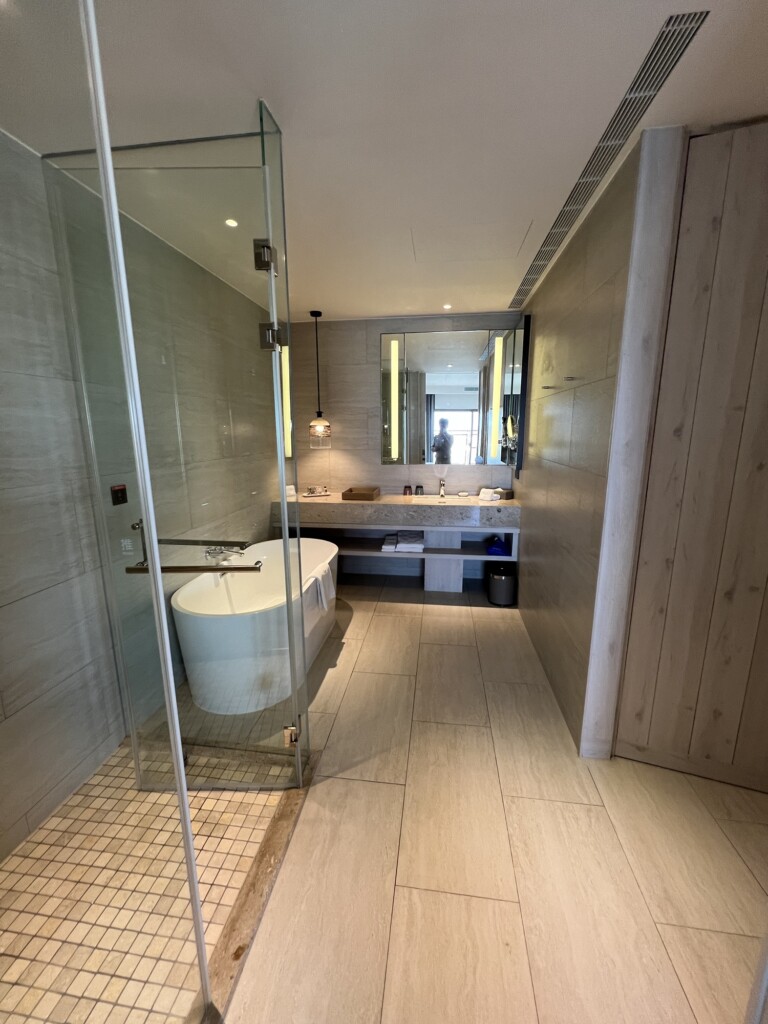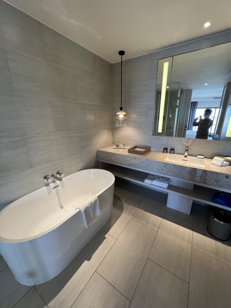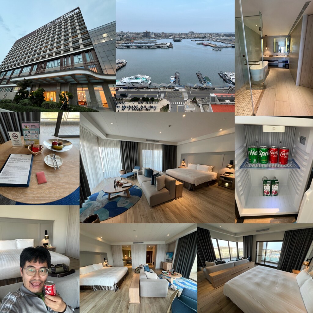 今日入住位於12樓的邊間澄曦行館,房間很新質感超棒,含陽台有23坪非常大,兩面採光整個窗景(港景)非常讚,浴室也蠻大一間有浴缸可以泡澡還不賴,冰箱裡也有可樂雪碧與蘋果汁各兩瓶,客廳茶几上也有迎賓餅乾與水果可以享用,基本上就是一整個舒適,除了出門享用晚餐外其他時間大概都要賴在房間好好休息了,飯店早餐也是很豐盛多元,用餐環境也很好,飯店設施有泳池、籃球場、烤箱、蒸氣室等還算多元,時間夠可以好好體驗享受,另外飯店有提供免費接駁車往返機場,記得提早預約呦!按往例,先來張開心打卡組合照吧^_^