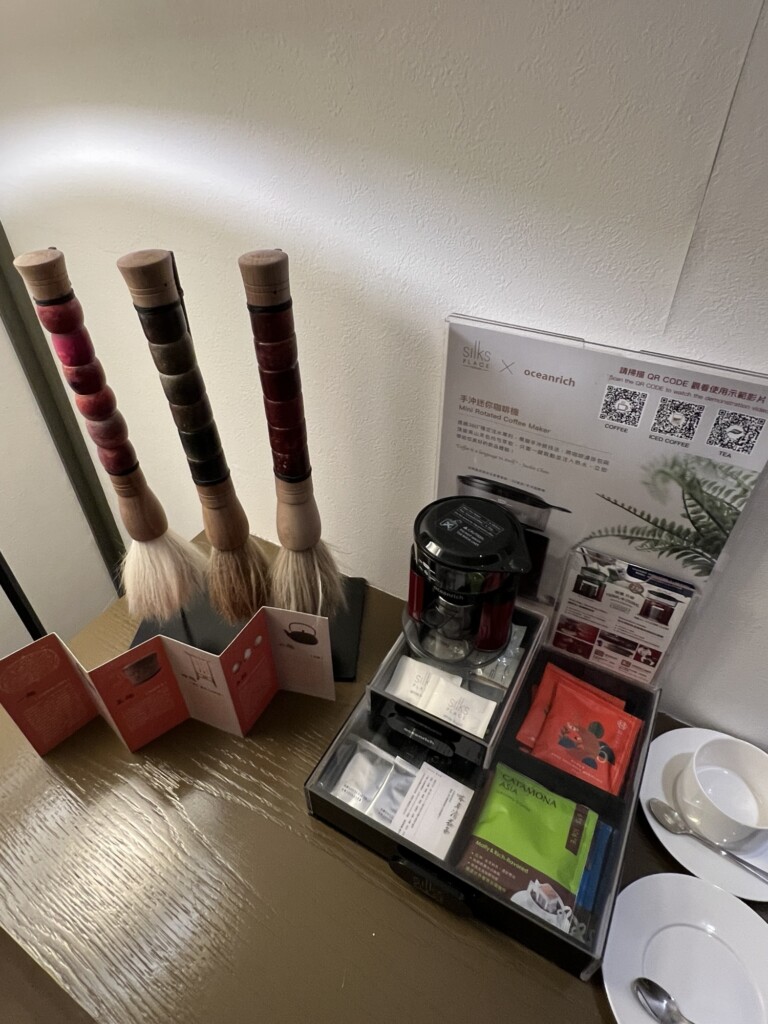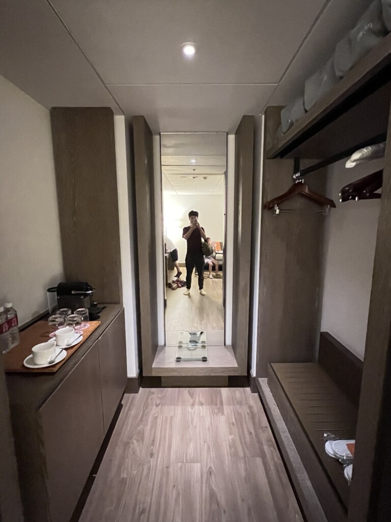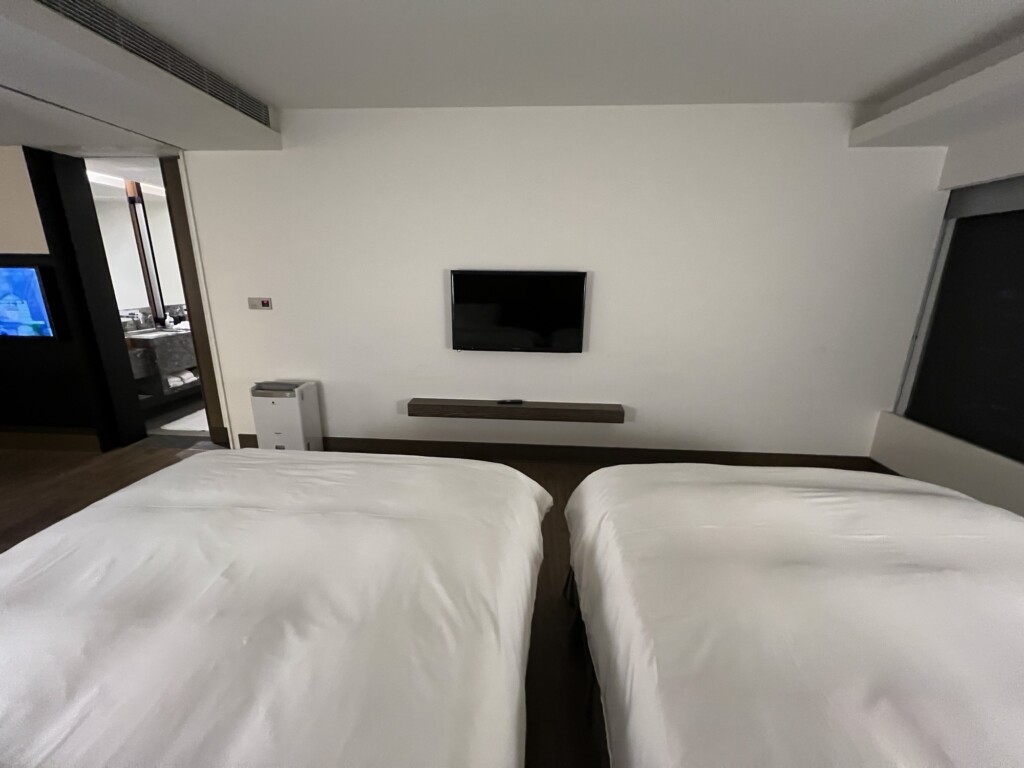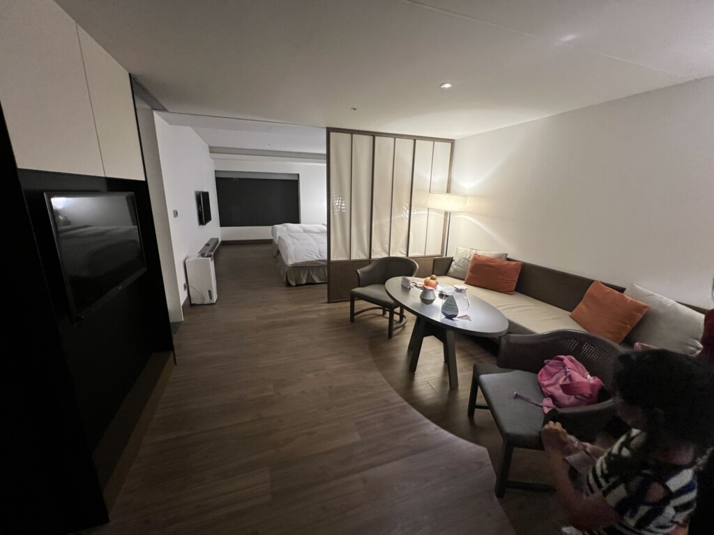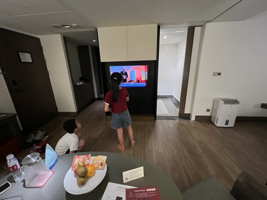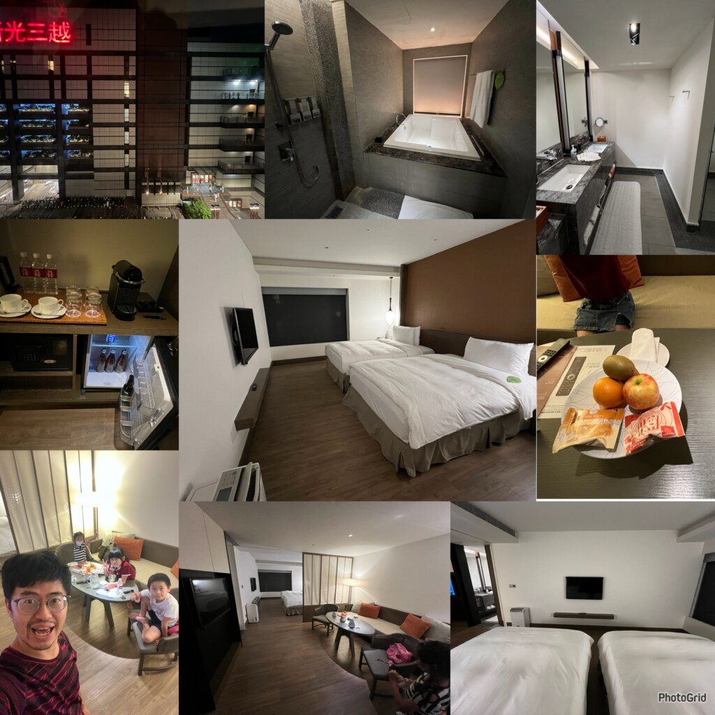 上次入住台南晶英是7年前,當時Molly與Hardy都非常小,這次三寶都長好大可以下水游泳啦!上次來入住是小西門套房一大床,這次則是入住小西門家庭套房兩中床房型,房間約17坪還蠻大的,一房一廳一衛一更衣室&迷你吧區空間配置的還不錯,木地板搭配燈光整體質感很好,客廳沙發蠻大的坐著看電視還不錯,浴室有浴缸可以泡澡還可以兩人躺不同邊聊天很讚,桌上有迎賓水果與餅乾,迷你吧有寶礦力、啤酒、還有紅茶還不錯,愛喝氣泡水的朋友電梯旁邊還有氣泡水機可以飲用,窗外景觀普普(小西門套房幾乎都是面對後棟新光三越),飯店早餐可以選西式或中式,這次我挑了中式早餐來享用整體評價非常好,按往例,先讓張開心打卡組合照吧^_^