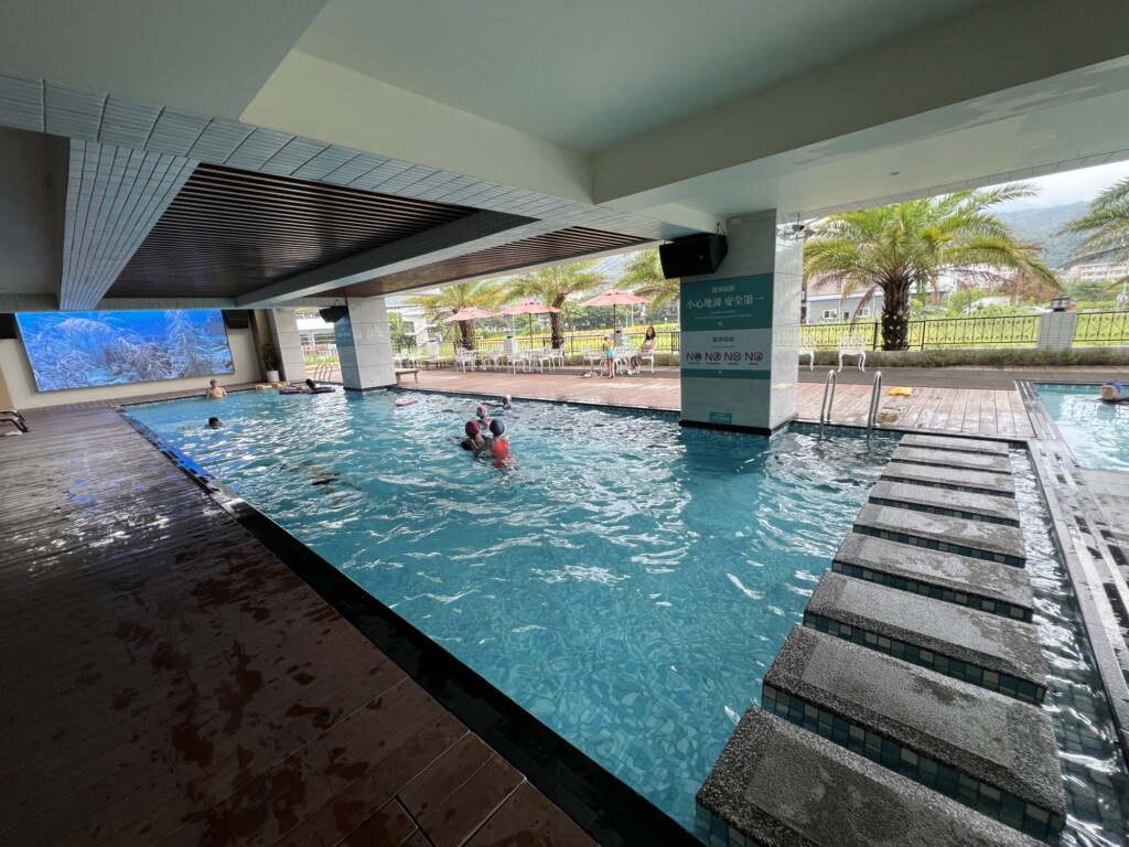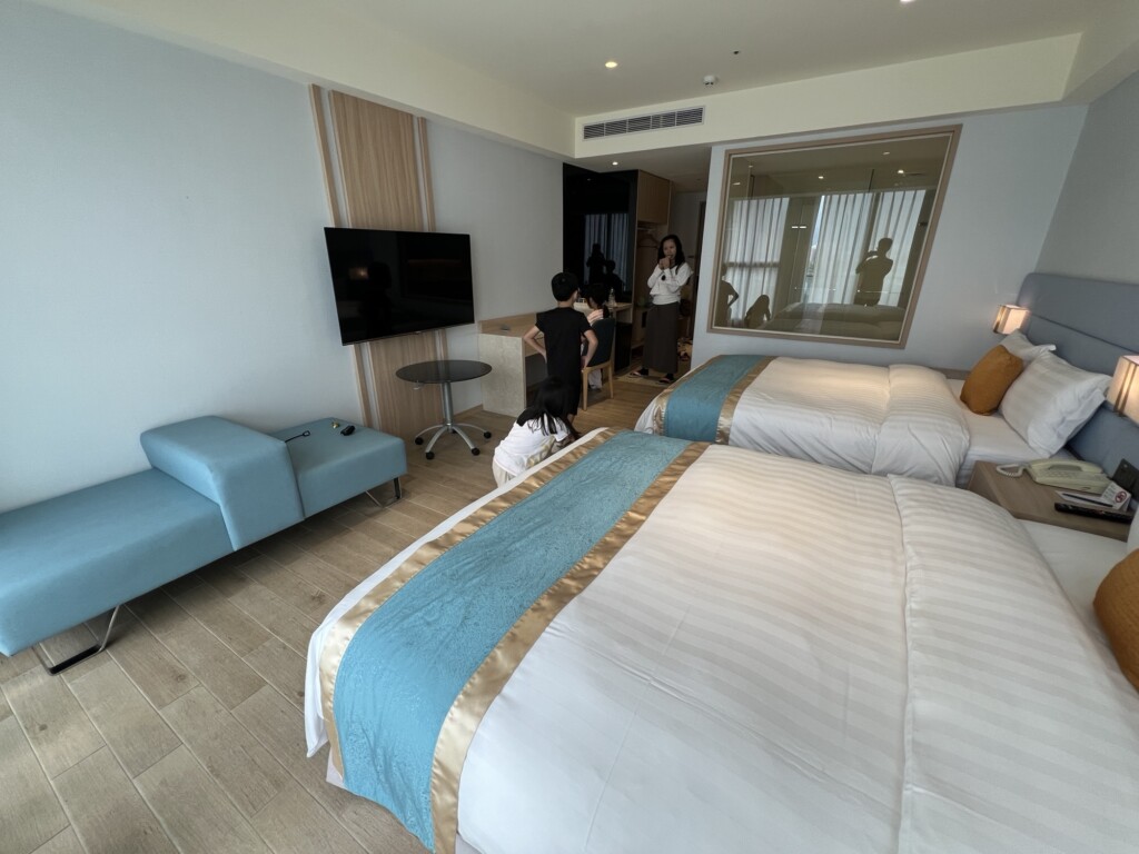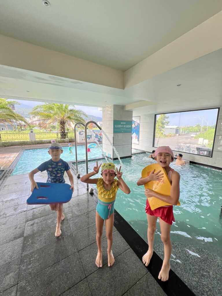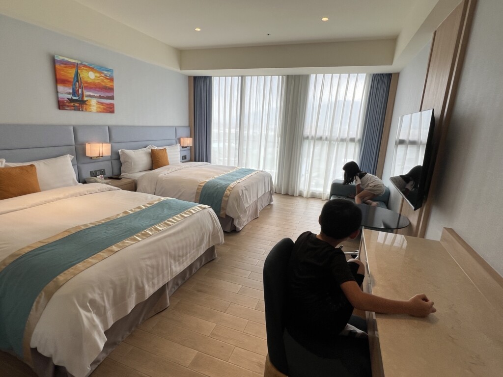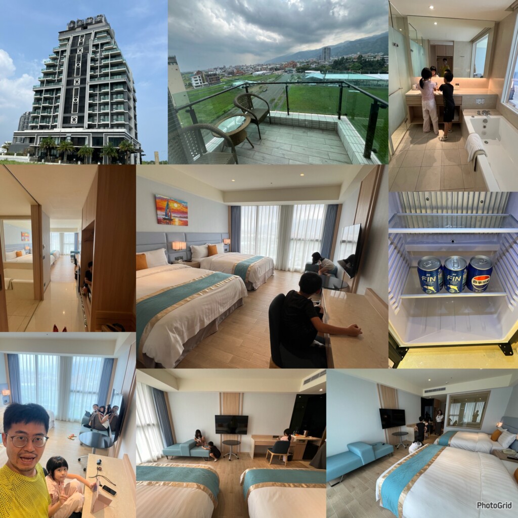 由於之前網路上有買到5000住宿+2000餐飲的券,官網上看到一個升等四人房含早餐方案5600,因此就來開心入住啦!今日入住山景四人房,房間含陽台約10坪空間還算舒適,房間很新質感很好,兩中床房型入住兩大三小基本上還行,窗外山景(一點點海景)還算蠻美的,浴室有浴缸可以泡澡(還可以享受牛奶浴)很不錯,飯店有泳池也有遊戲室,晚上的泳池還有播放電影,遊戲室裡面還有switch可以玩,非常適合親子同樂,飯店晚餐不便宜,不過如果要便宜可以到頂樓「星空看海吧」去吃簡餐,飯店早餐也還蠻豐盛的,用餐環境也不錯,服務人員整體態度都還蠻好的,入住時1樓還可以拍照(傻瓜相機洗照片出來那種),按往例,先來張開心打卡組合照吧^_^