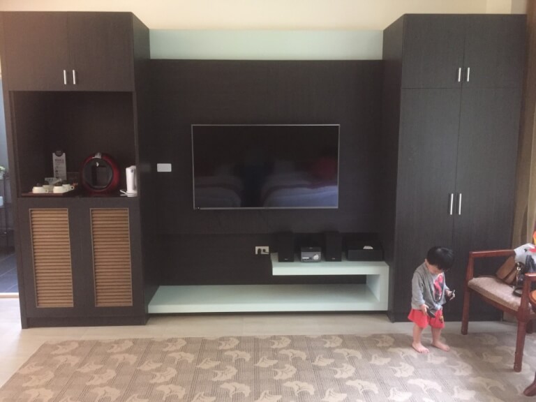 床頭往電視方向拍,左前方迷你吧還有膠囊咖啡機呦!