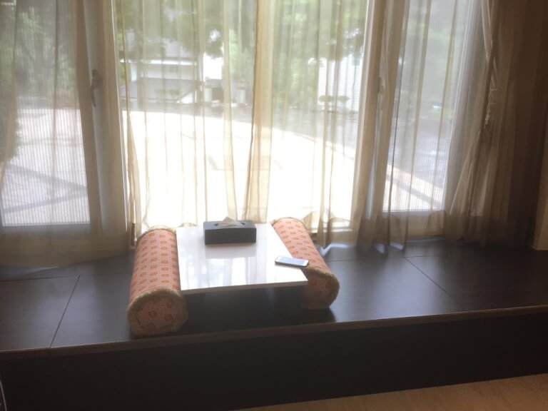 房間有一個木製架高平台可以喝茶聊天並望向外面的風景~還不錯