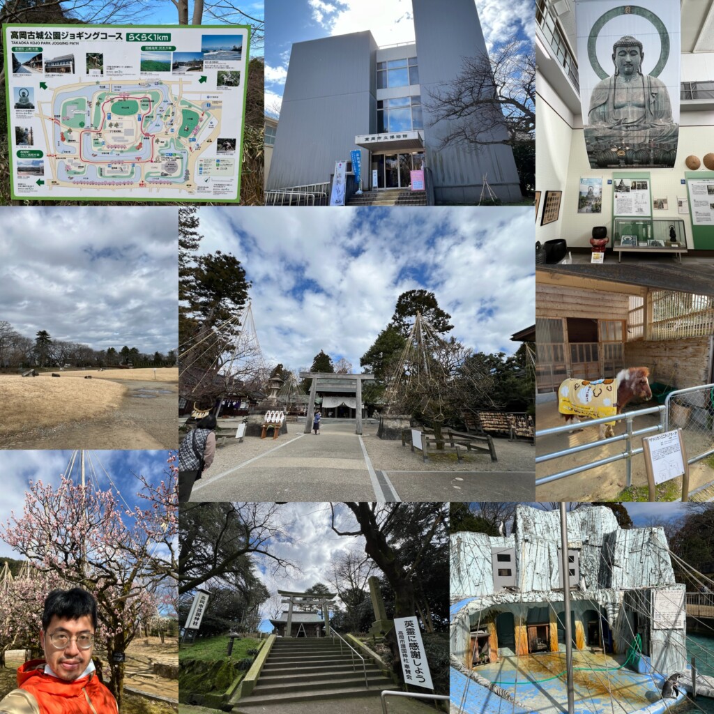 這古城公園人不多空氣也蠻好的,有兩個神社,射水神社規模較大有比較多人參拜,而古城的部分已經變成一個平坦的草原,另外有個梅園,2月中過去已開花超過一半還不錯美,最後古城公園旁一個小小的動物園,裡面有企鵝、羊、馬、猴子、鸚鵡、…還不賴,最後這裡也有個高岡市博物館,裡面有介紹了高岡的歷史,還有介紹高岡大佛以及日本三大佛-奈良大佛、鎌倉大佛以及高岡大佛,想了解高岡市歷史的朋友這裡基本上是個很棒的地方,而我這次旅行遇到好天氣更是棒,以下為網誌心得分享,按往例,先來張開心打卡組合照吧^_^