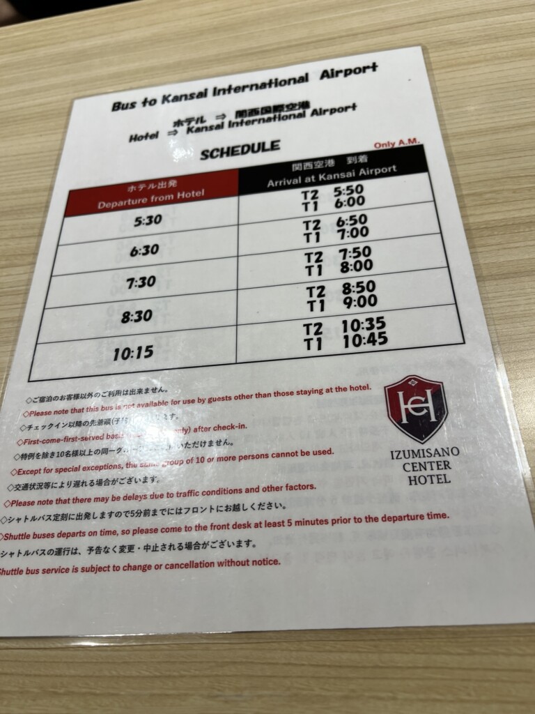 這次入住泉佐野中心酒店基本上還算滿意,房間舒適又大,樓層也很高窗外景觀也很好,浴室有浴缸可以泡澡,早餐也有一定水準,還有提供免費接駁車前往機場(我們沒用到XD),服務人員態度整體上也是很好,如果價格不貴的話我是非常推薦,推薦給大家^_^