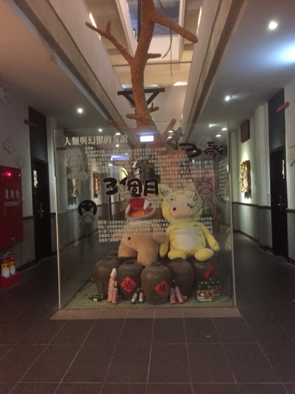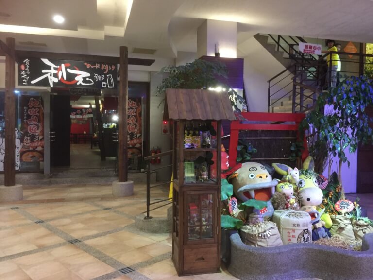 晚上的妖怪村櫃台,都光還算浪漫,旁邊有很多妖怪玩偶