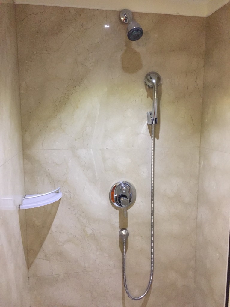 除了蓮蓬頭外,也有花灑可以沖頭,米黃色大理石裝潢質感算不錯