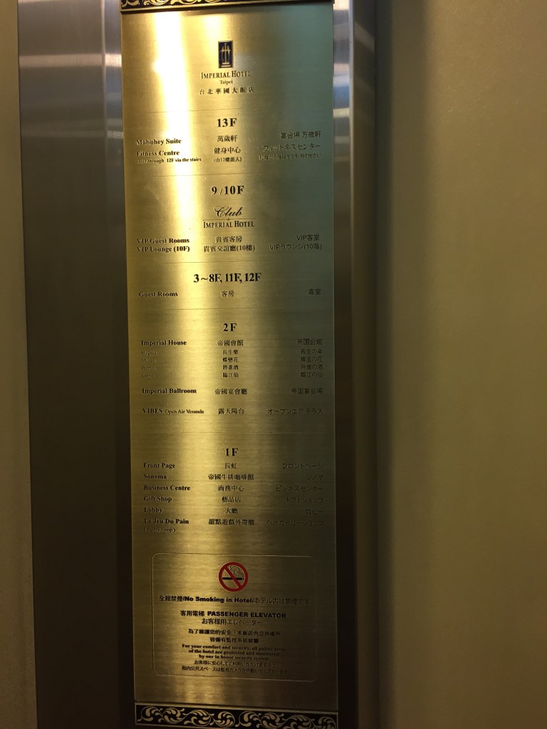 回到飯店後來拍一下電梯口,質感還ok,跟台北國賓感覺有點像