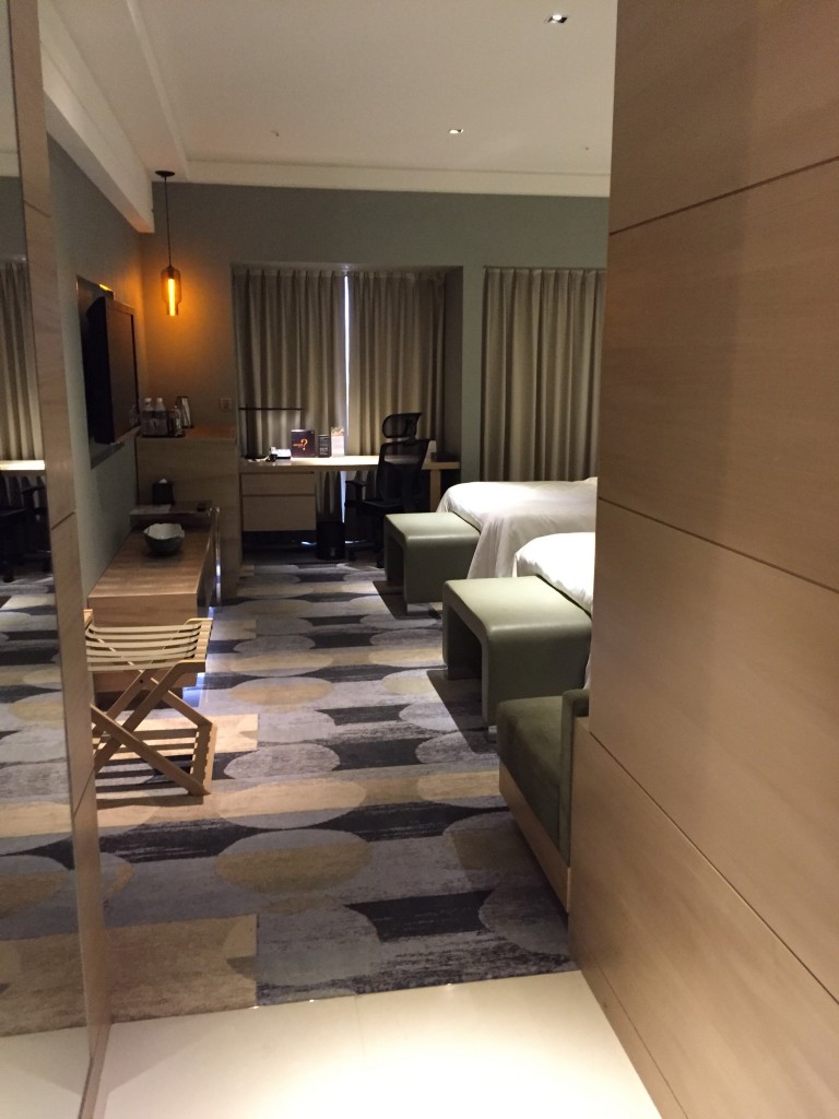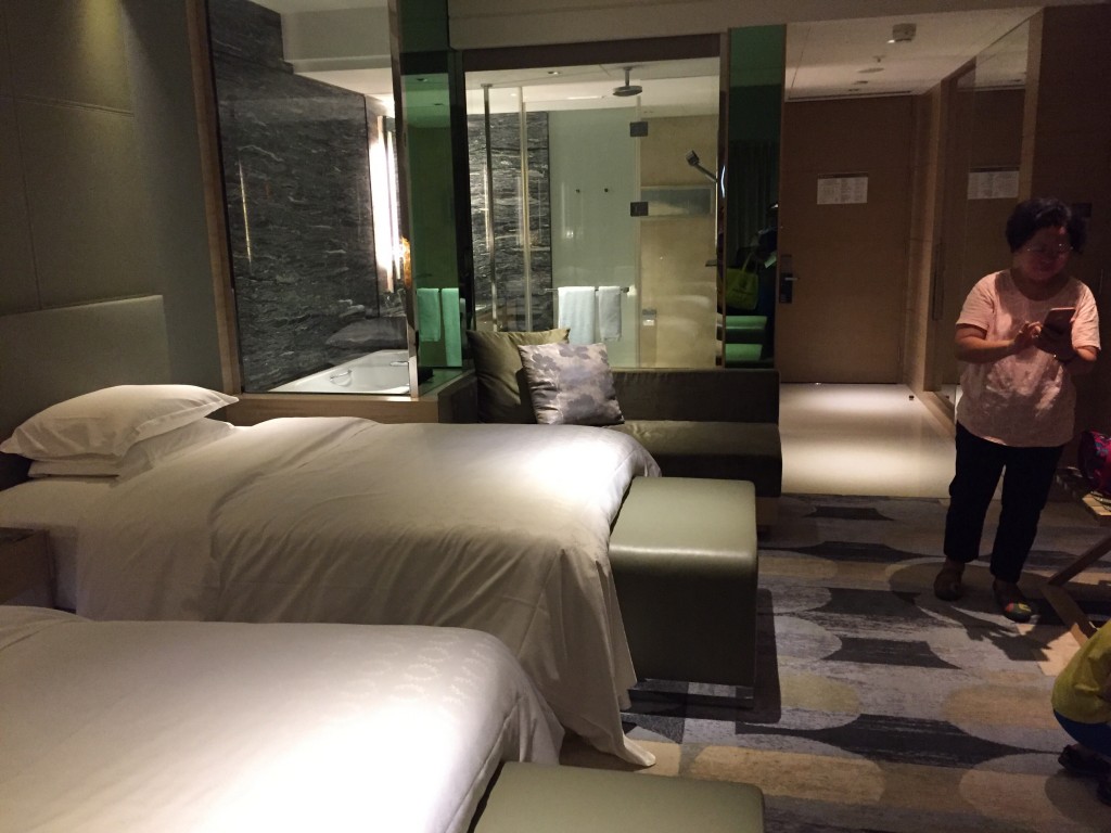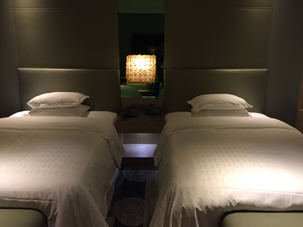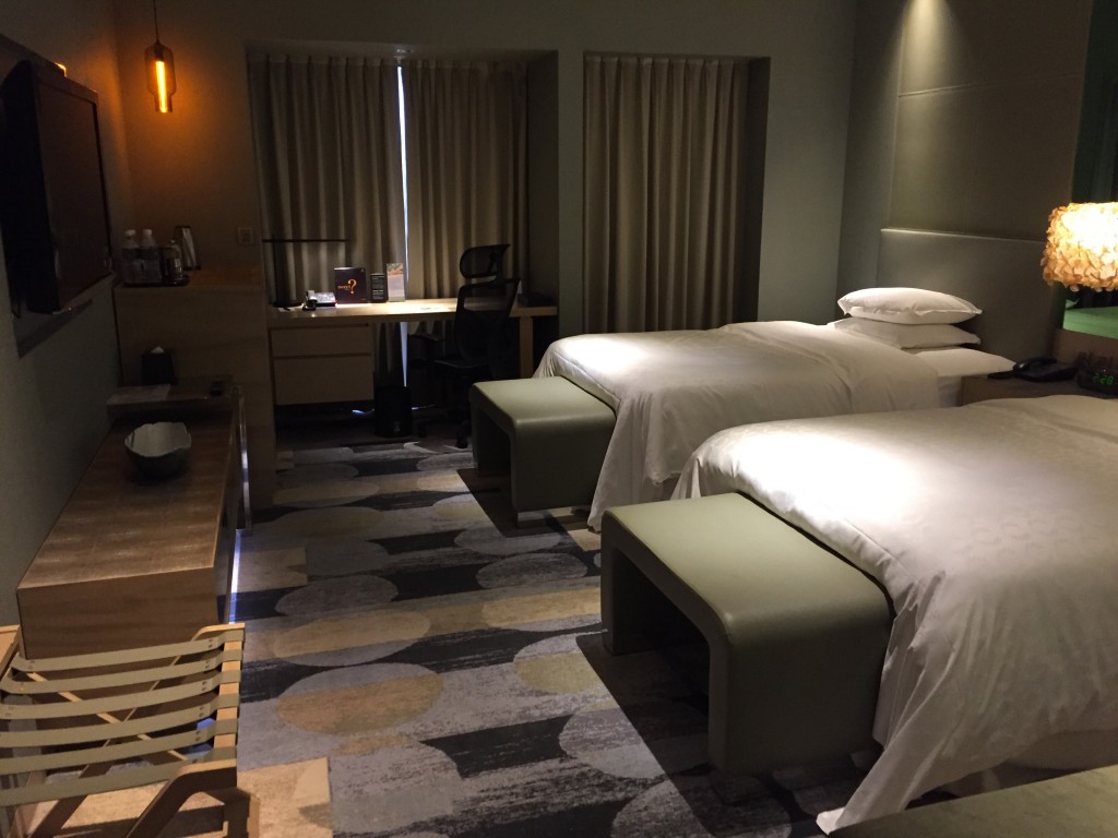 新竹喜來登高級雙床房質感很不錯,兩張單人床寬度有135公分,睡一大一小基本上是可以的