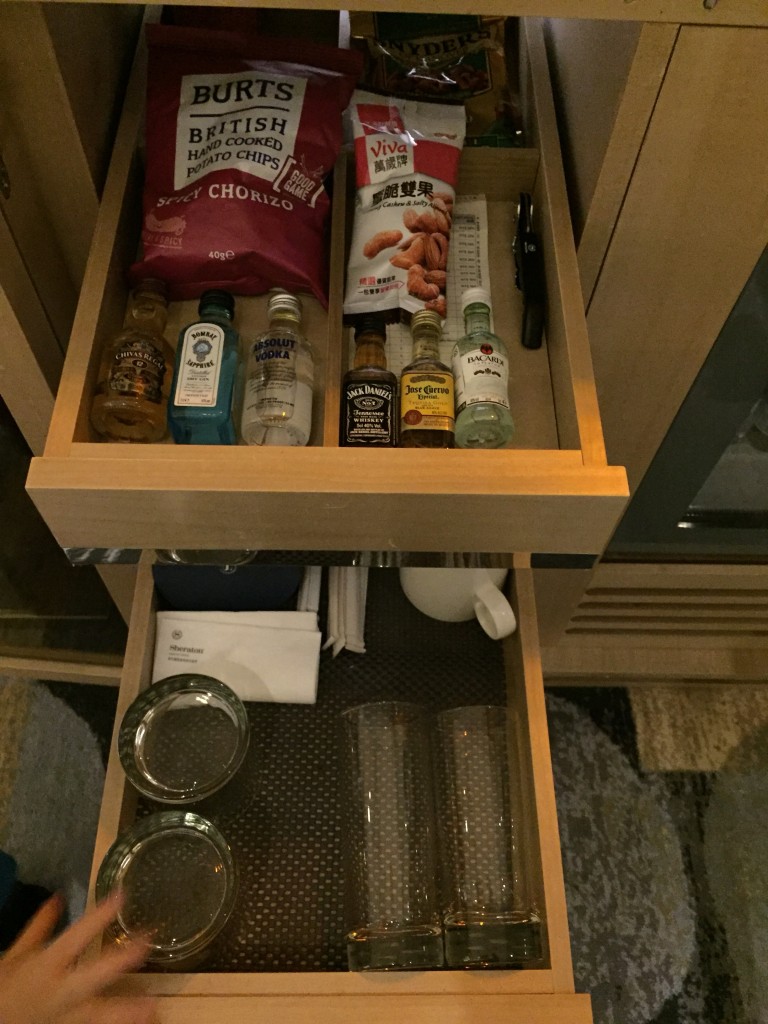 迷你吧與辦公桌的方向一拍,四瓶礦泉水很不錯