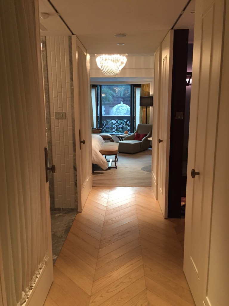 進門啦~這豪華客房設計很詭異,進門要先往右再往左走才會看到房間,前方是廁所門