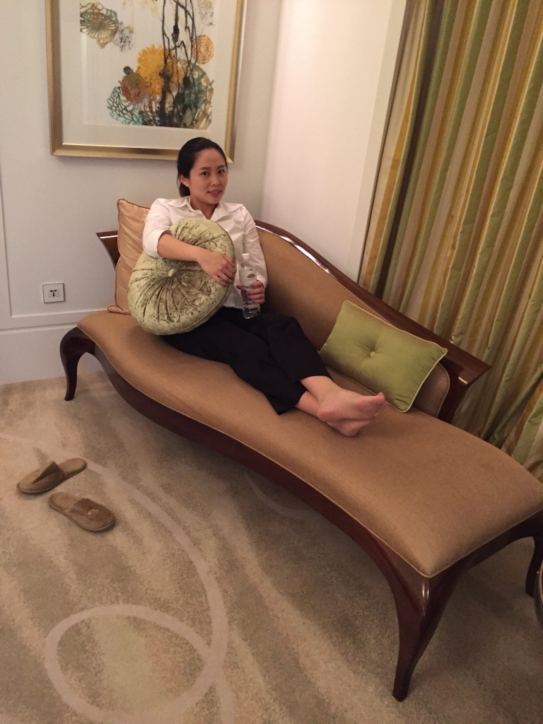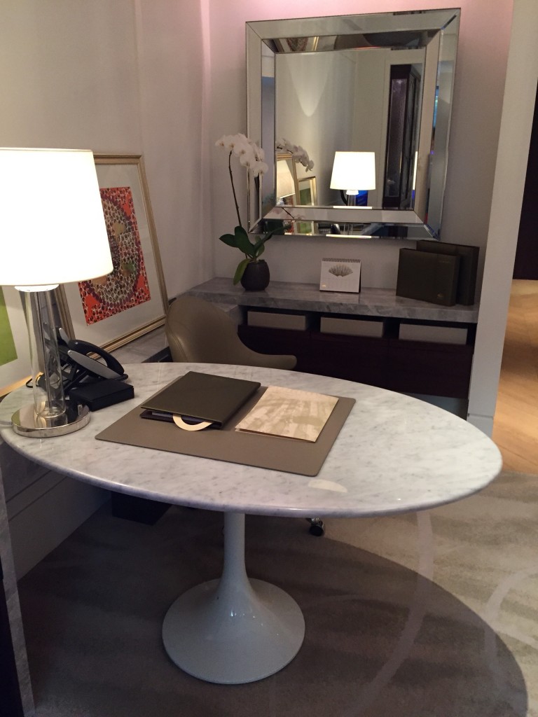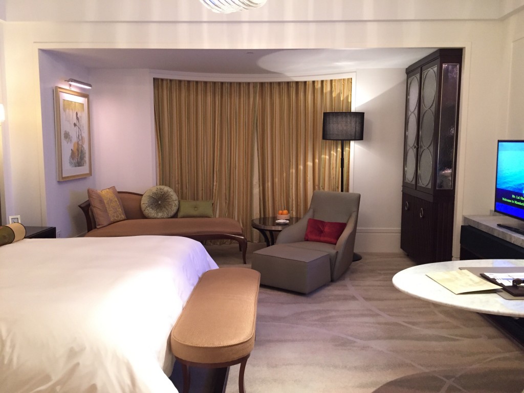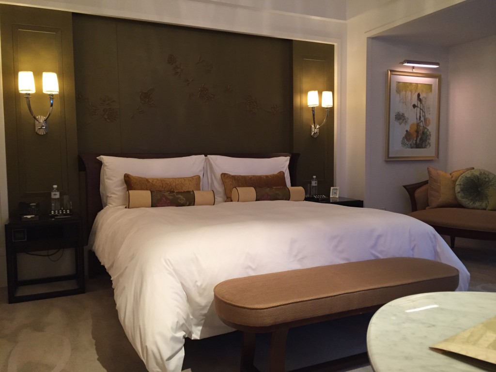 客房一拍,美美的大床、床尾椅、貴妃椅 、沙發,還有大理石辦公桌搭配美美的窗景及特色水晶燈與素雅的地毯也是令人陶醉~