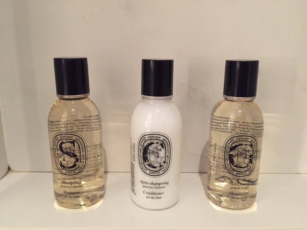 洗手台上兩瓶礦泉水與備品, 是Diptyque的品牌