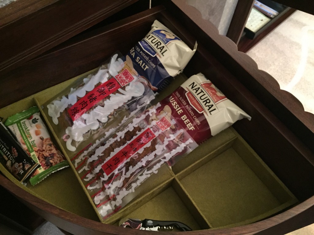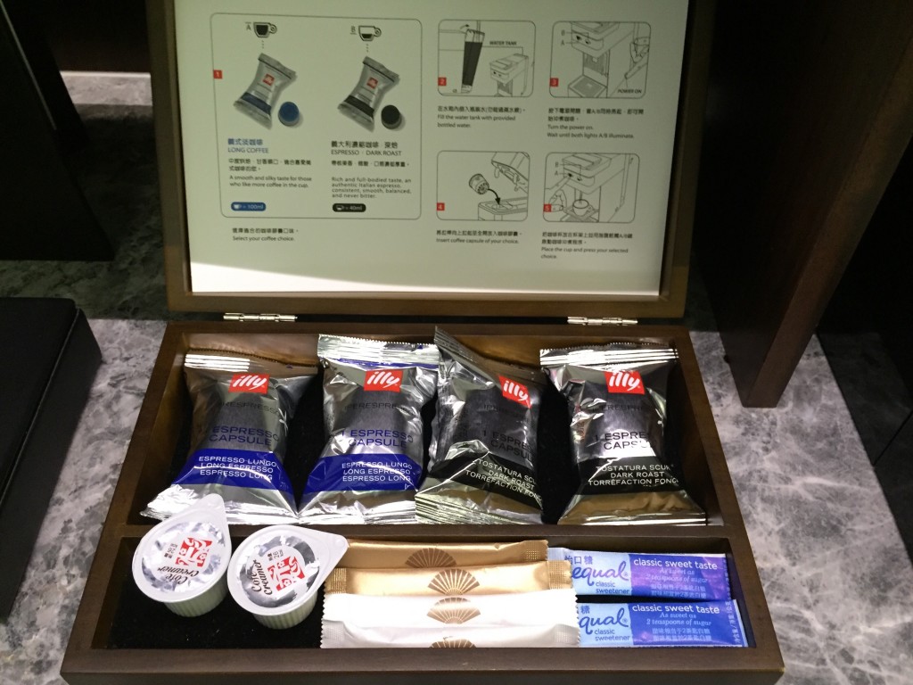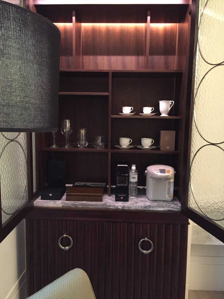 接著來看一下櫃子裡面有什麼,水杯、咖啡杯、膠囊咖啡、茶包、熱水瓶及旁邊也擺了兩瓶礦泉水