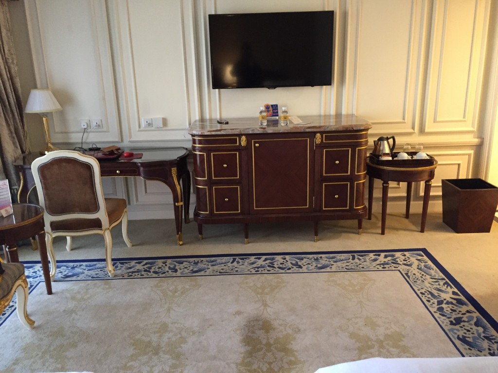 床頭往電視一拍,電視櫃上可以擺放物品,旁邊有辦公桌可供商務人士使用電腦,地毯也很正點,只是由於飯店年代較久有使用痕跡質感會稍微差了一點