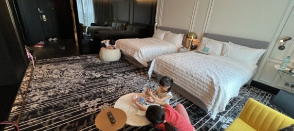 離開挪威森林台中文創館後,我們從文創園區走路到火車站,再過個馬路就到今日要入住的飯店-台中李方艾美酒店啦!這次使用住宿券入住經典客房,被升級為中樓層還行,兩中床房型約13坪睡我們兩大三小還算舒適,艾美對兒童很友善,基本上可以免費入住,房間很新類似精品飯店設計,整體質感很不錯,浴室也有浴缸可以泡澡很棒,窗外景觀還不差,不過迷你吧冰箱裡的飲料要錢,另外台中艾美的早餐算是蠻不錯的,用餐環境好而且豐盛好吃,按往例,先來張開心打卡組合照吧^_^