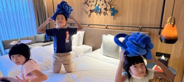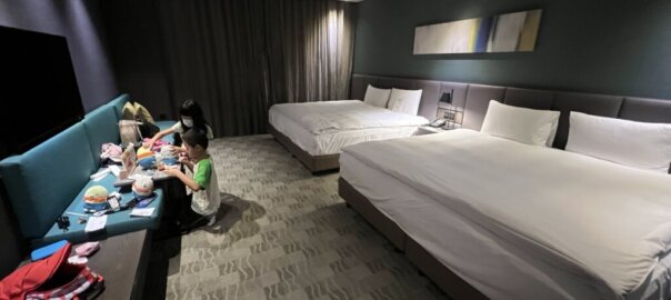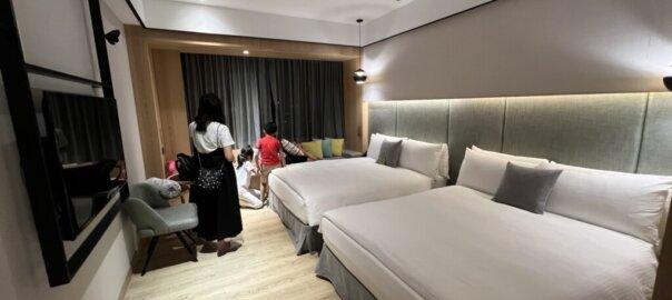 享用完晚餐後,我們就來到今日要入住的飯店- 嘉義長榮文苑酒店,今日入住高級家庭房,兩大床房型睡我們兩大三小還行,房間大小約9坪搭配木地板質感很新,冰箱也有提供四瓶飲料可以喝非常棒,浴室是淋浴設備沒有浴缸有點可惜,窗外景觀還行(可惜不是面故宮),飯店也有泳池可以讓小孩開心游泳,也有遊戲室讓小朋友可以玩switch還不賴,休閒中心還有VR、桌球、撞球檯等等也很完整,健身房也是必備的囉!早餐的部分個人覺得中規中矩沒有特別驚艷(可能是前一天入住阿里山英迪格?),住新飯店就是開心,按往例,先來張開心打卡組合照吧^_^
